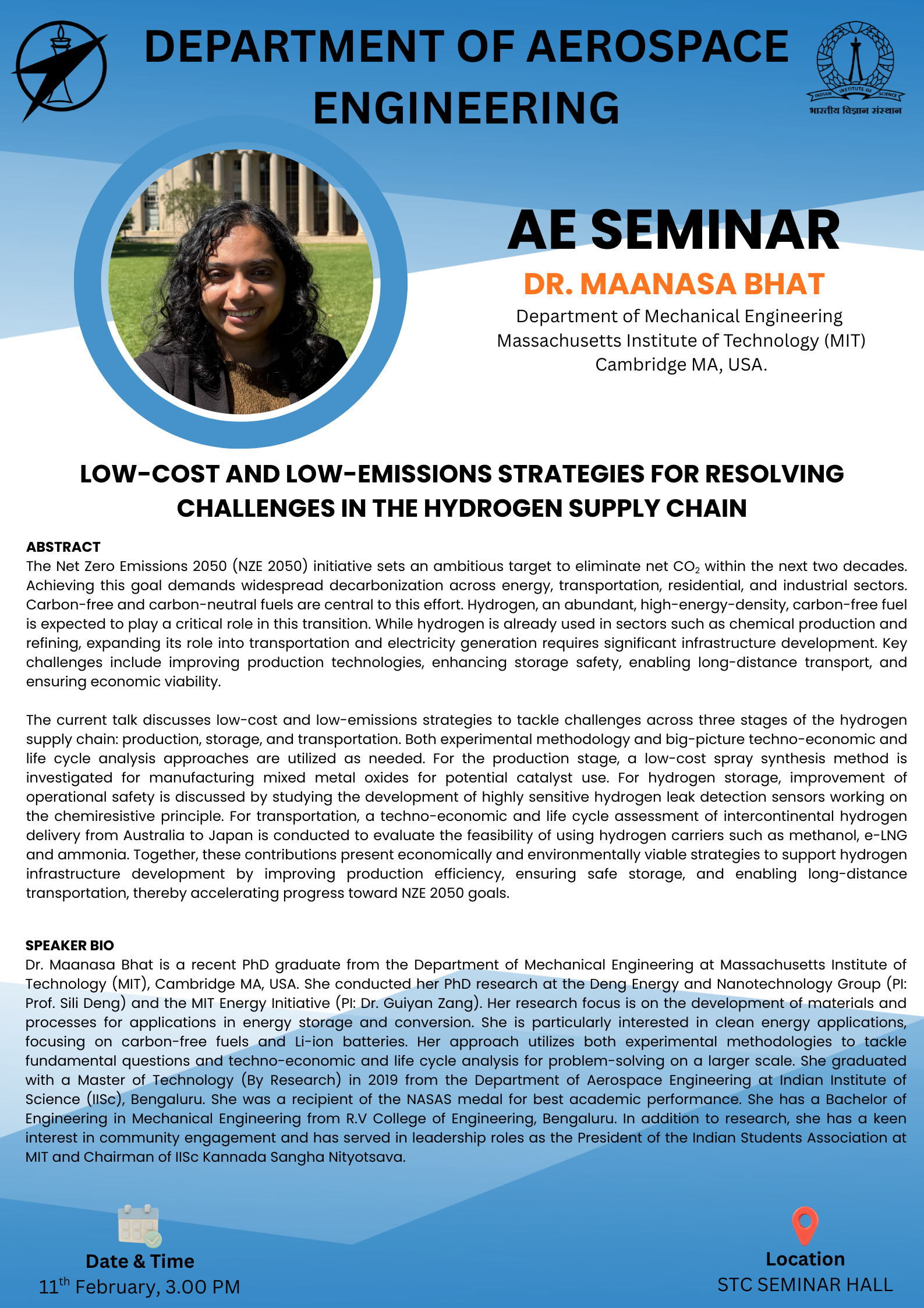 AE Seminar-Dr Maanasa Bhat: Low-cost and Low-emissions Strategies for Resolving Challenges in the Hydrogen Supply Chain