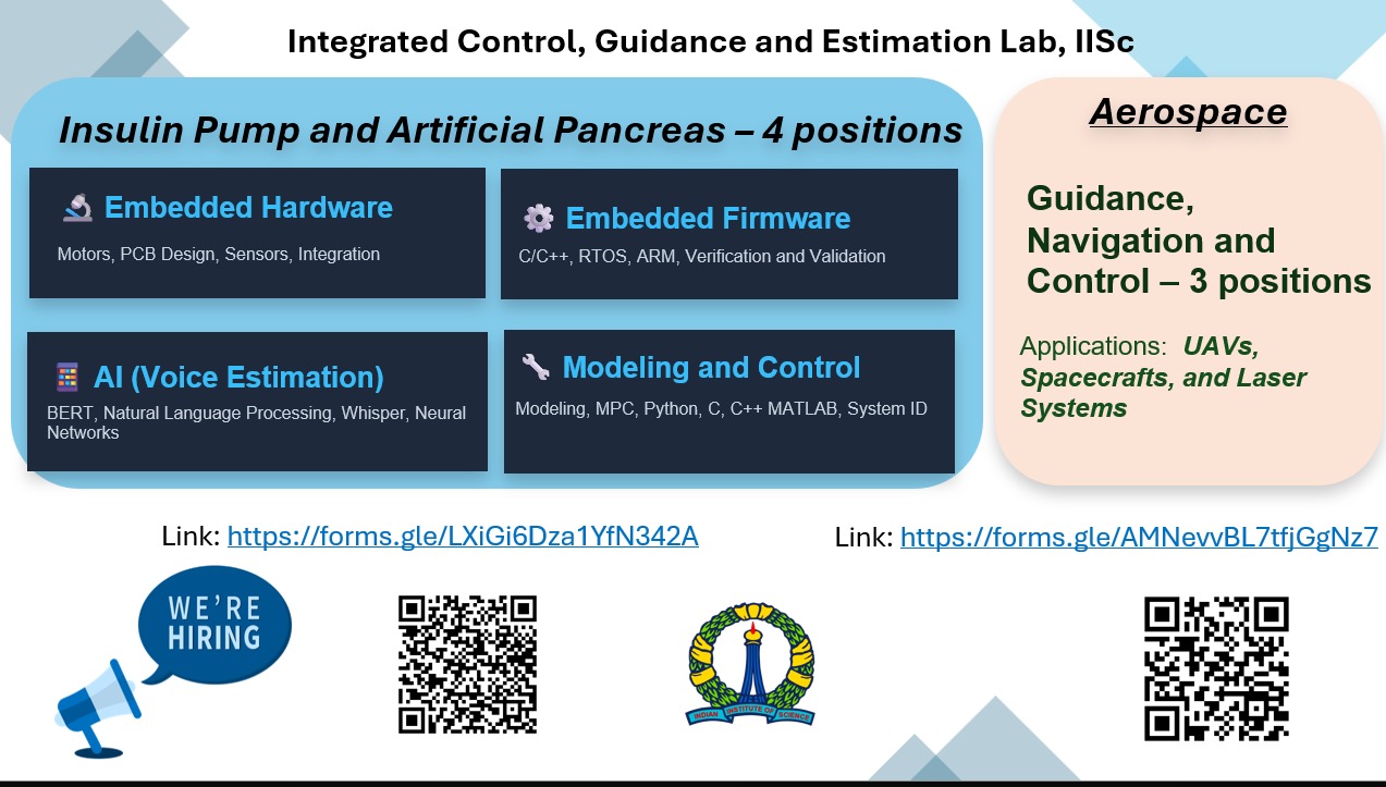 We are constantly looking for project assistant and project associate positions, which are meant for people having bachelor and master degrees respectively. Desirable qualification include ME/MTech or BE/BTech in Aerospace, Electrical, Electronics, Instrumentation & Control, and Mechatronics engineering securing 80% or above and with at least one course on control systems (others need not apply). The candidate is expected to know and *enjoy* topics in applied mathematics (such as differential equations, matrix theory, numerical methods & 2D/3D geometry) and the relevant domain knowledge. He/she should also have good knowledge in computer programming in MATLAB/Simulink/C/Python. Knowledge on embedded systems and control implementation on hardware boards will be an additional advantage. The candidate is expected to have secured good marks in the control systems and mathematics subjects. Candidates about to graduate can also apply. However, their formal appointment will commence only after producing a ‘provisional certificate’ about completion of the degree.